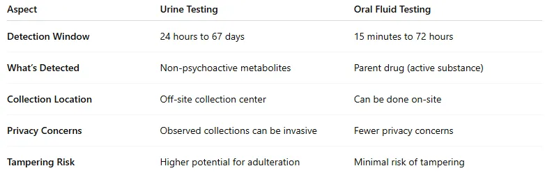 Example: For post-accident or reasonable suspicion testing, oral fluid testing offers an immediate window of detection that may be preferable. However, for random or follow-up testing where patterns of drug use need to be identified, urine testing might still be the better option.